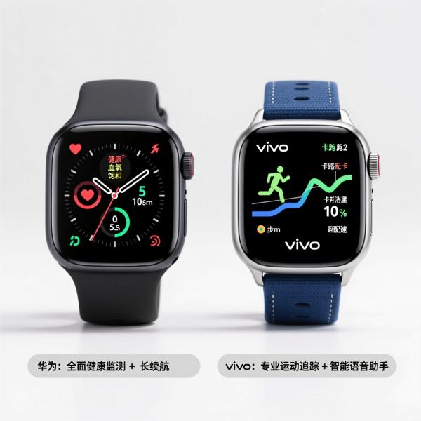 搭载华为TruSeen 5.5心率监测技术,数据准确性较高。 支持血氧、压力、女性健康管理(经期追踪)。 运动模式96种,新增羽毛球挥拍动作识别,但GPS为单频。Vivo Watch GT: