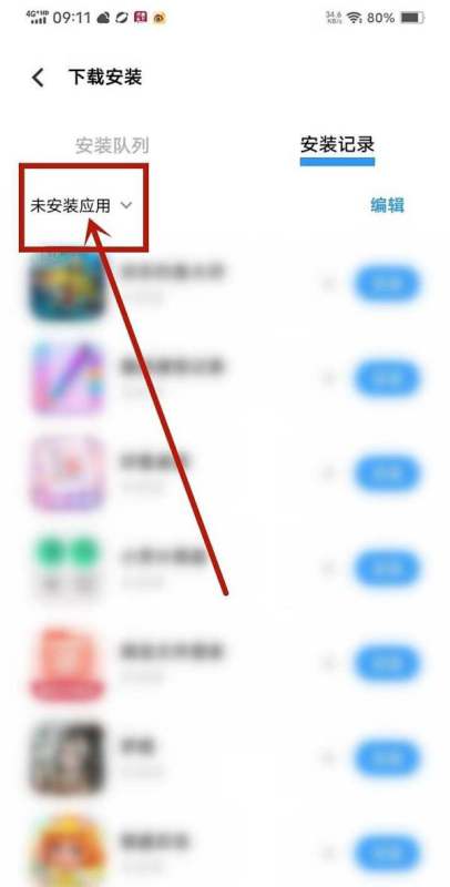 筛选未安装应用进入安装记录页面后,点击左上角的【未安装应用】选项。此操作会过滤掉当前已安装的软件,仅显示已被卸载或曾经安装过的应用。