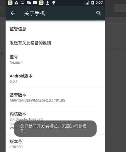 6、若已经开启了“开发者选项”,在点击“版本号 LRX22C”会有相应的提示;