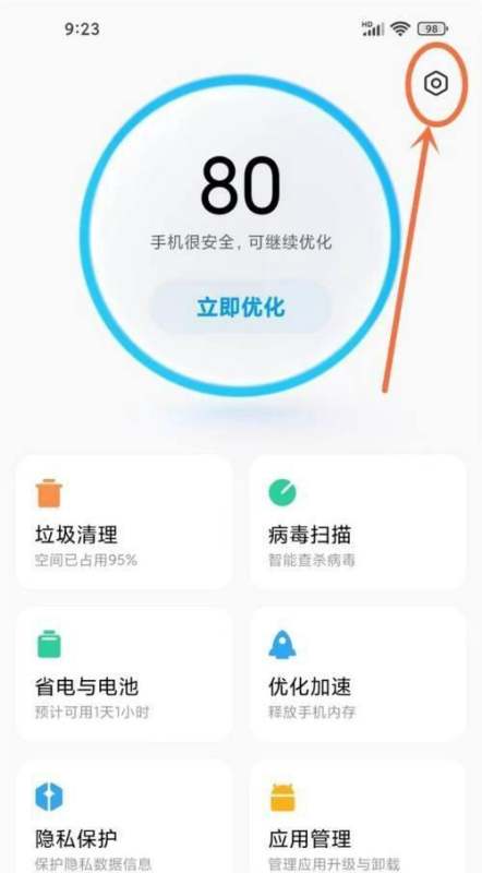 步骤一:打开手机管家首页,点击顶部“设置”按钮打开手机中的“手机管家”应用,进入首页后,在界面顶部找到并点击“设置”按钮,进入系统设置页面。