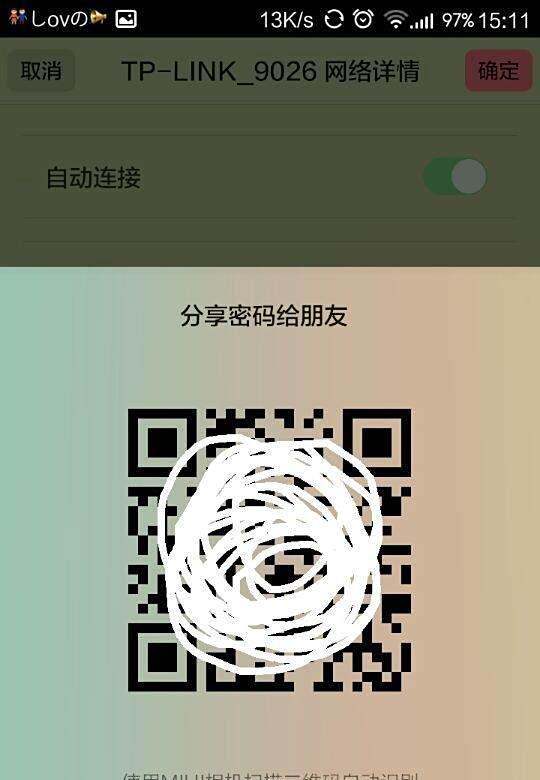 生成密码分享二维码在网络详情页点击【分享密码给朋友】,系统会生成包含WiFi名称和密码的二维码界面。