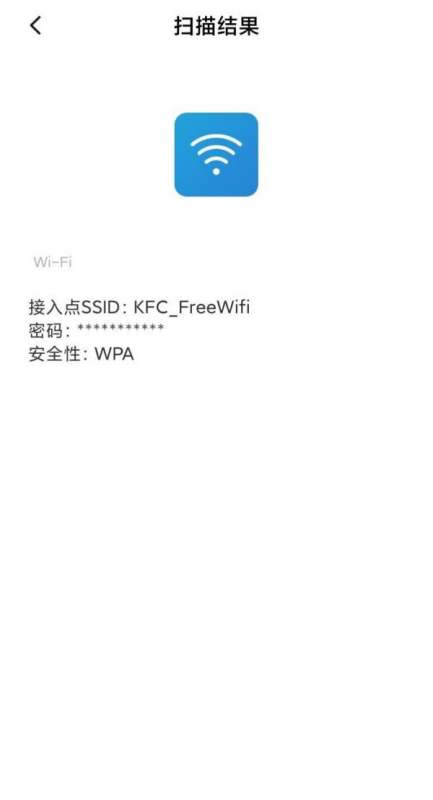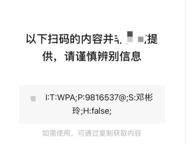 查看密码结果微信识别二维码后,会弹出包含WiFi名称和密码的文本框,密码部分通常以明文形式显示。