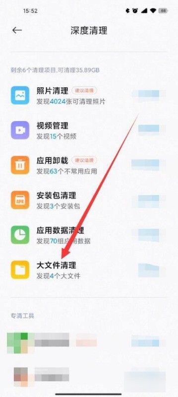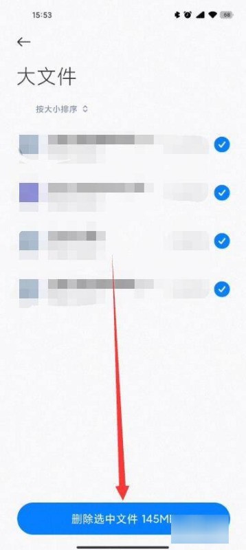 在存储空间中点击【大文件清理】,选择占用空间较大的文件,点击【删除选中文件】即可。
