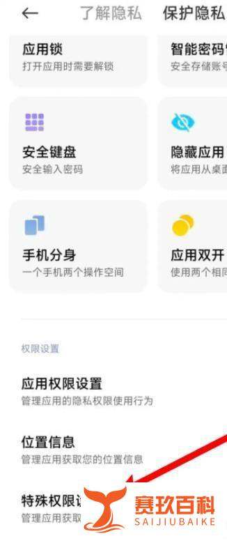 定位特殊权限设置在隐私保护页面底部,点击【特殊权限设置】。该选项涵盖安装未知应用、使用情况访问权限等高风险操作的管理入口。