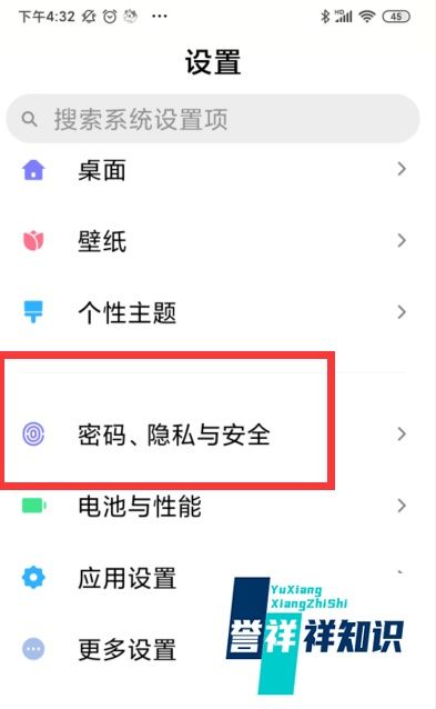 定位密码与安全选项在设置菜单中滑动查找密码与安全选项,点击进入该功能模块。