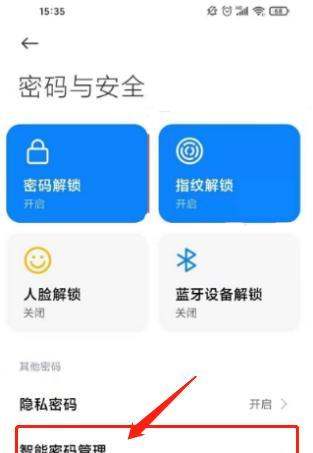 开启智能密码管理在密码与安全页面中找到智能密码管理功能,将右侧开关滑动至开启状态即可。