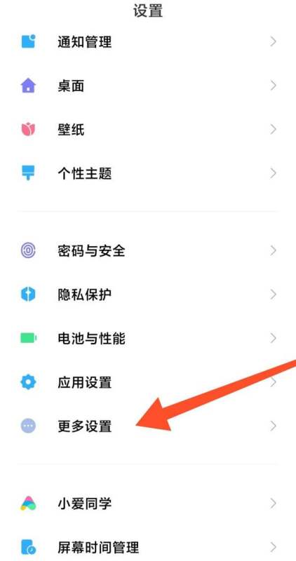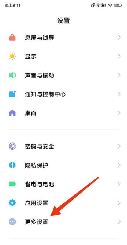 步骤二:进入更多设置在设置界面中,滑动屏幕找到更多设置选项,点击进入。