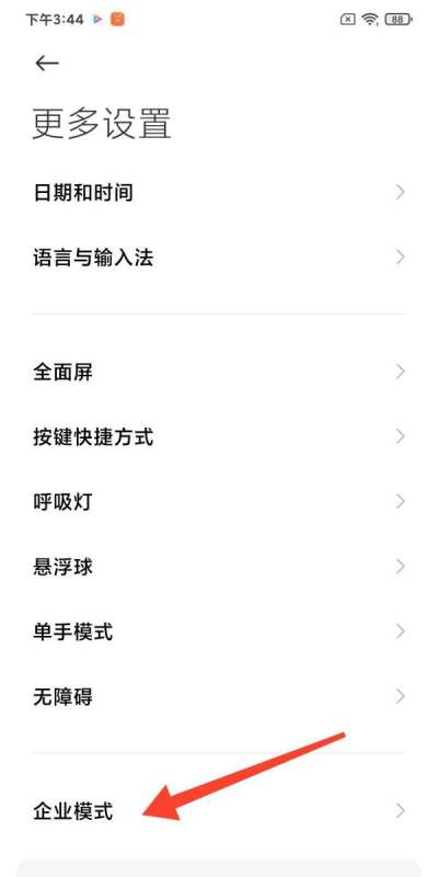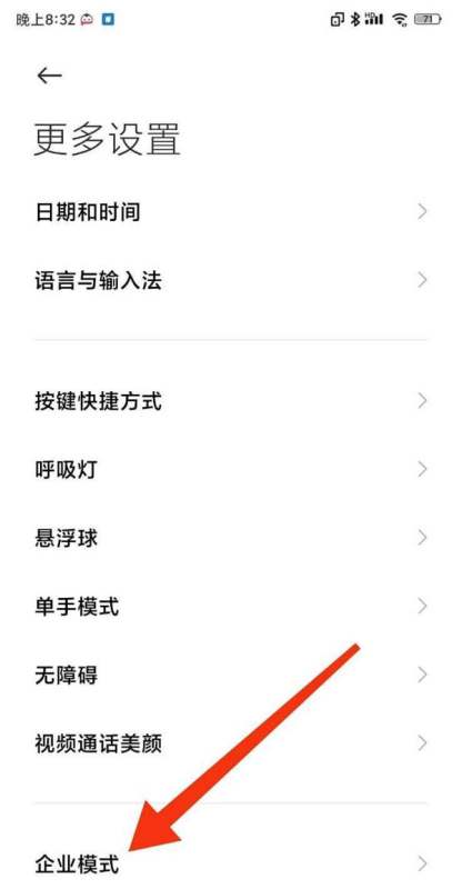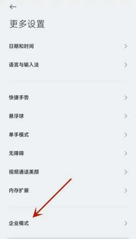 打开企业模式功能进入“更多设置”界面后,找到并点击“企业模式”选项。此时系统会显示企业模式的相关配置界面。