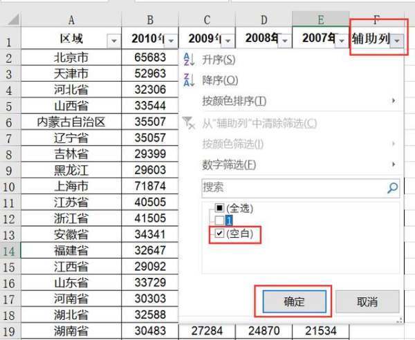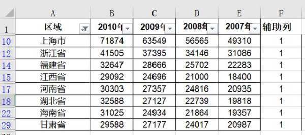 ?然后取消筛选内容,再次选择筛选,筛选辅助列的空白项目,便得到了除去上述8个省的数据。