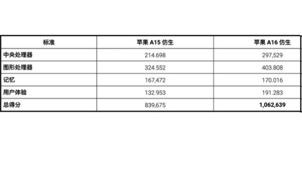 苹果A16和A15仿生芯片安兔兔成绩单: