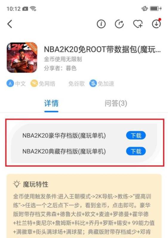 在安卓手机上通过魔玩助手APP下载NBA2K20手机版全明星存档版的方法如下:
