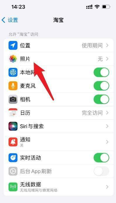 定位到照片权限设置项在设置列表中点击“照片”选项(部分设备可能显示为“隐私与安全性”下的子菜单)。该选项控制应用对相册的访问能力,若未正确配置会导致淘宝无法读取图片。