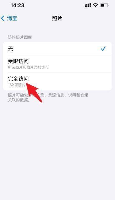 授予淘宝完全访问权限在照片权限设置中,将淘宝的访问权限从“无”“仅读取”等限制模式改为“完全访问”。此选项允许应用读取、编辑及发送相册中的所有图片,勾选后即可解决发送失败问题。