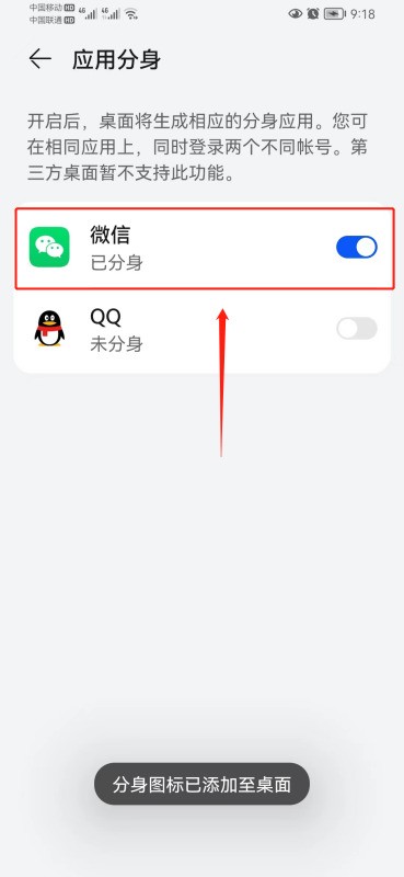 微信图标下方有个数字2,就表示这个是应用分身的,可以同时登录使用。