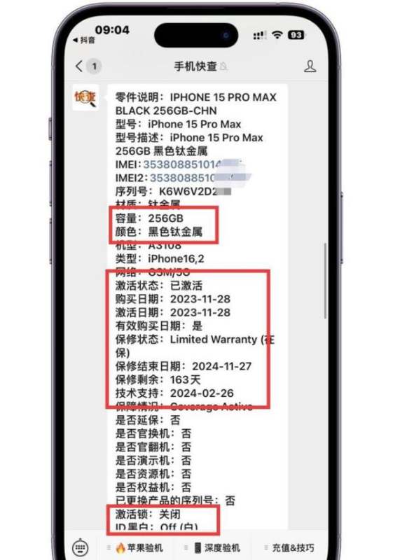 数据验证:通过序列号查询整机报告,核对激活日期、保修剩余、网络锁、激活锁等关键信息。例如,某粉丝购买的机器为256GB黑色国行版本,去年11月激活,剩余100多天保修,激活锁关闭、无网络锁、未送修,数据完全正常。