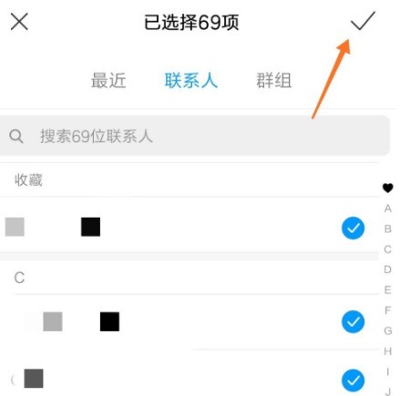 7、勾选联系人,点击右上角的对号。