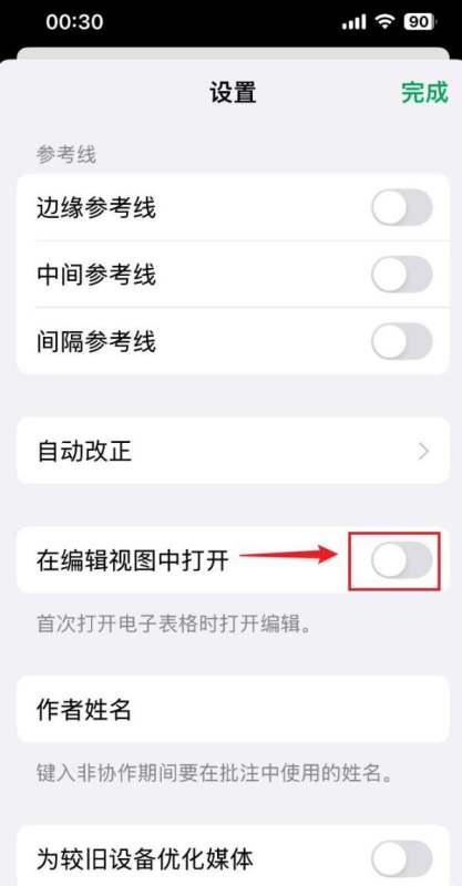 开启编辑视图:在设置界面中,找到【在编辑视图中打开】选项,将其右侧的滑动条向右滑动至开启状态(滑动条显示为绿色或蓝色)。