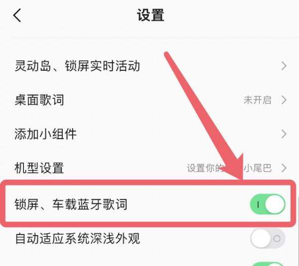 找到 「车载蓝牙歌词」 开关,将其滑动至 开启状态(显示为绿色)。
