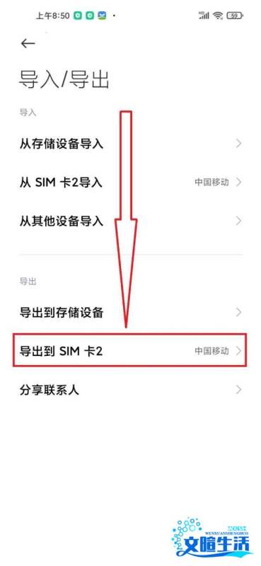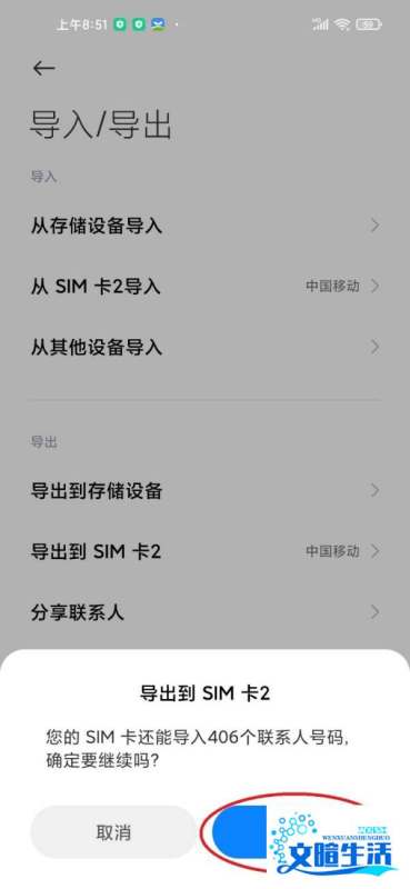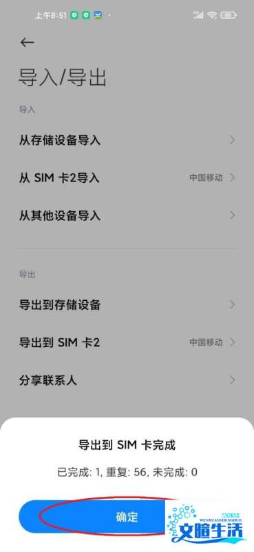 步骤5:选择导出到SIM卡在导入/导出页面中点击“导出到SIM卡”,系统将提示确认操作。