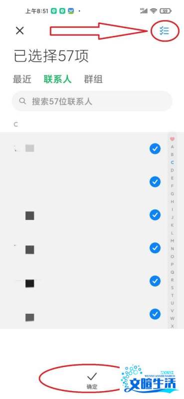 步骤7:全选联系人并确认点击右上角“全选”标识(或手动勾选需要导出的联系人),然后点击下方“确定”按钮。
