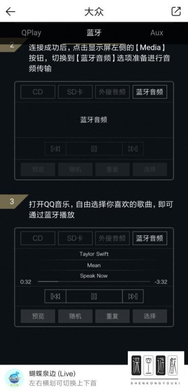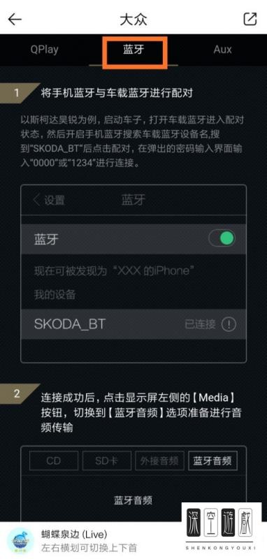 8. 第八步,除了使用数据线连接之外,还可以使用蓝牙进行配对,成功连接蓝牙,只需要打开QQ音乐,即可在车上播放歌曲。