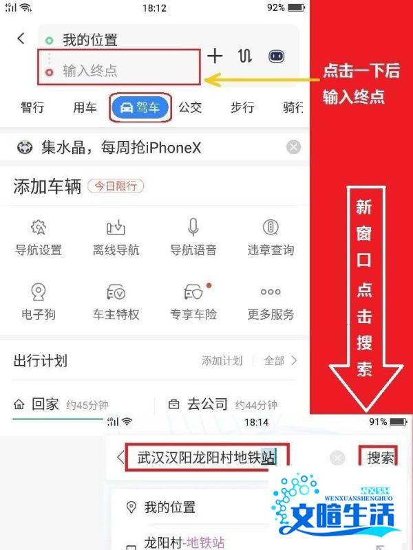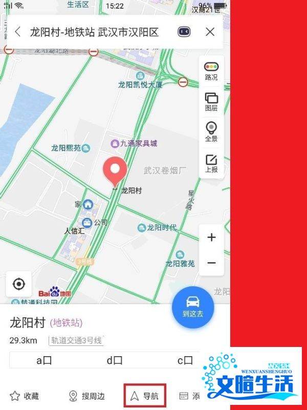 在界面上方的搜索框中输入要去的目的地名称(如“龙阳村-地铁站武汉汉阳”)。输入后会出现多种交通方式选项,包括步行、骑自行车、驾车、公交等,根据需求选择。若选择公交,会显示具体乘车路线及上下车站点;此处以驾车为例。