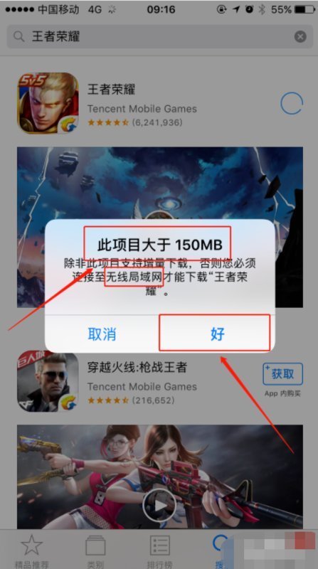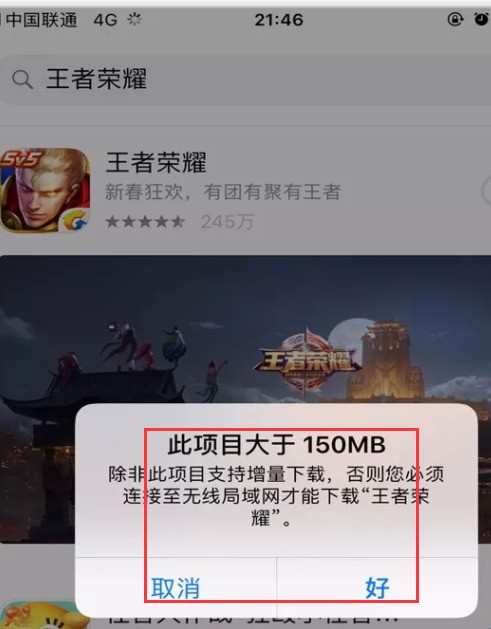 2、进入苹果8手机App Store后,搜索王者荣耀点击下载,会显示此项目大于150MB无法使用流量下载。
