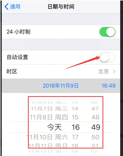 6、然后关闭自动设置按钮,将手机时间往后调3天。(比如今天是11月9日就调至11月12日)