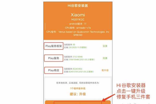 一键云端修复:打开“Hi谷歌安装器”,点击下方的“一键云端修复”,根据提示完成修复步骤,直至“Play服务框架、Play服务、Play商店”这三项的状态都显示“完成”。