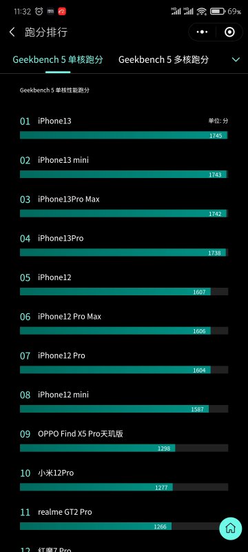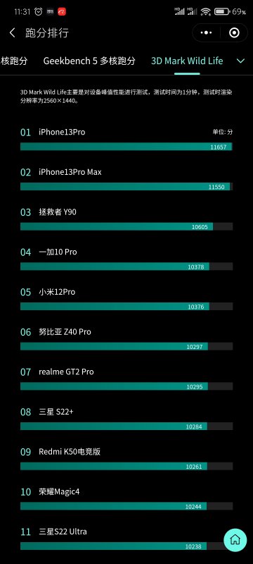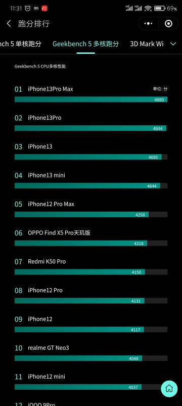 这是目前市面手机跑分排行 虽说跑分不代表一切 但是就目前iPhone13的A15芯片性能处理能力 当之无愧的移动端处理器第一