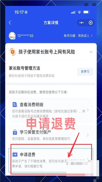 进入申请入口点击公众号菜单左下角“我是家长”→“探索平台”→“网络管控家长必知必会”→“孩子网络不理性消费”→“申请退费”。